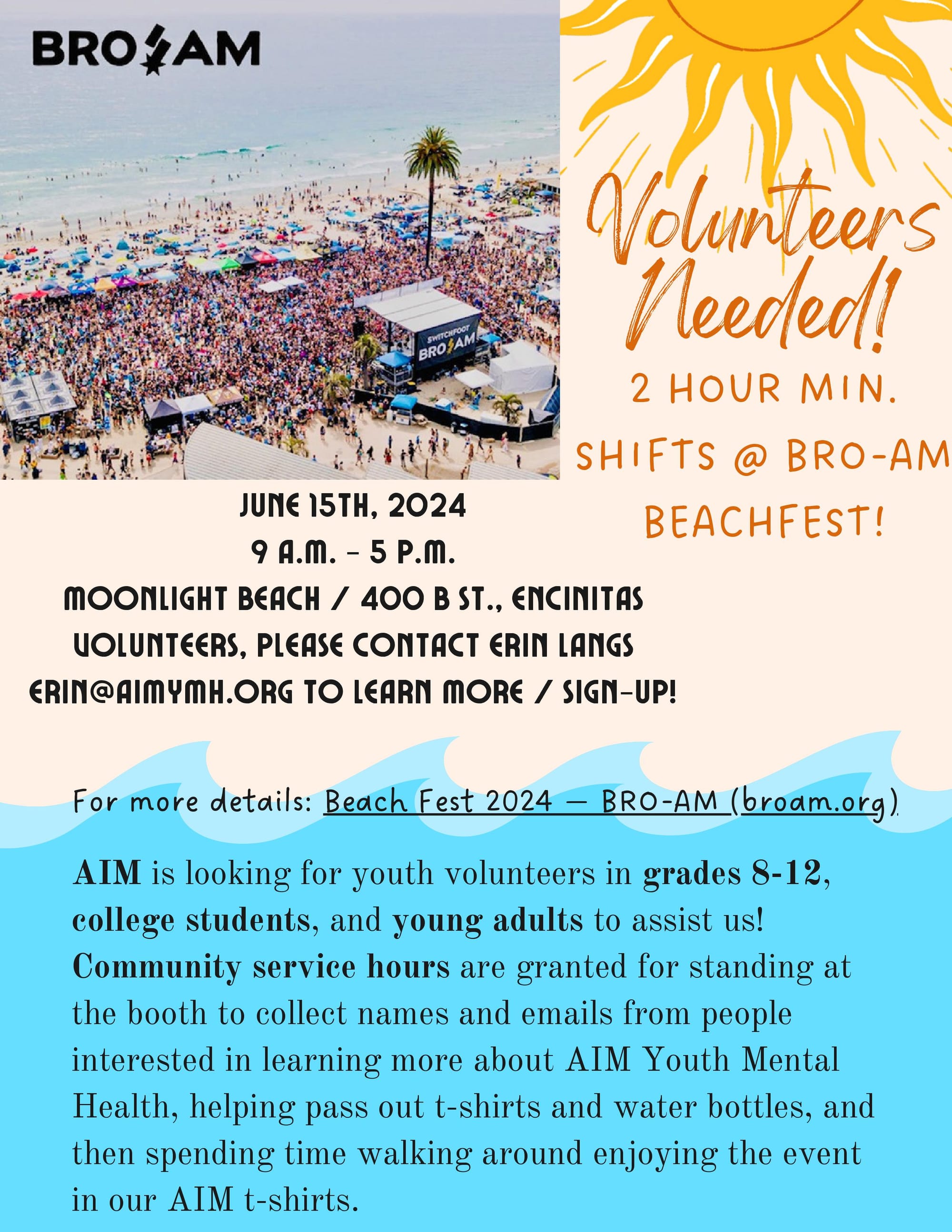 Thank you for your interest in volunteering with AIM Youth Mental Health! You are invited to join AIM at the Bro-Am Beachfest on June 15th. Get a free AIM t-shirt, hang out at the booth and enjoy the day by and helping us spread the importance of supporting youth mental health!